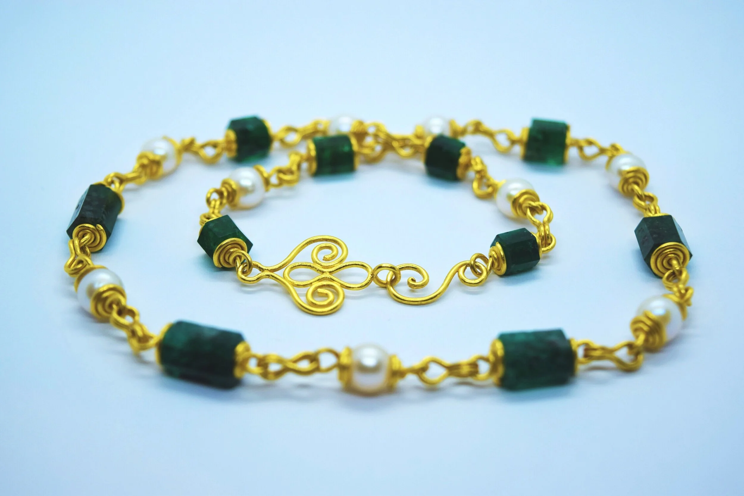 A hand-crafted intricate 22k gold sailor’s chain links stunning emeralds and pearls, with a love-inspired clasp that can be worn in the front, back, or side. 18”